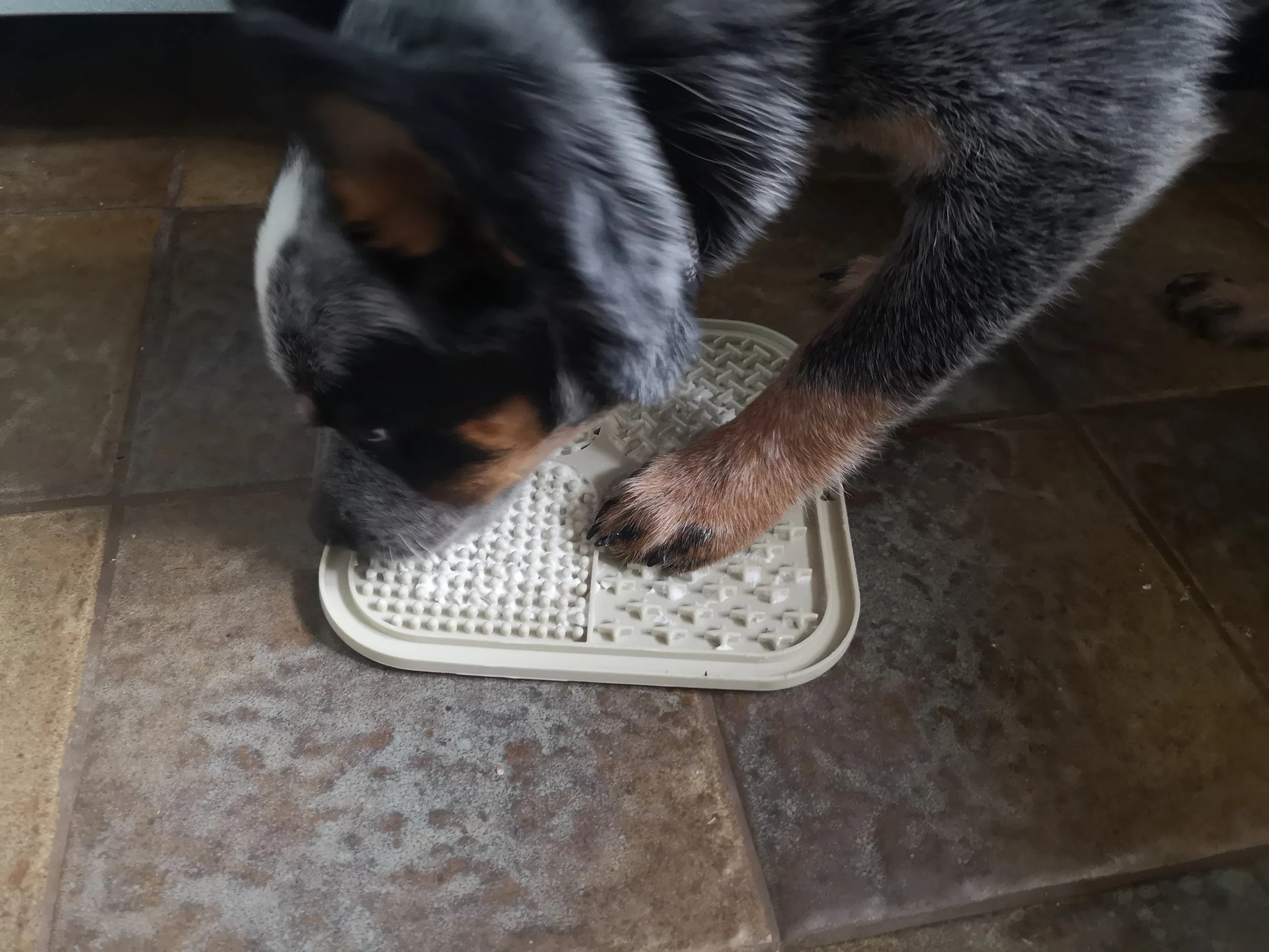Anfangs haftete die Matte noch am Bodenfliesen. Doch wer FYPS kennt, weiß: Wenn er sich einer Aufgabe widmet, dann mit vollem Einsatz. Durch seine durchaus „engagierte Bearbeitung“ löste sich die Schleckmatte schließlich vom Boden.