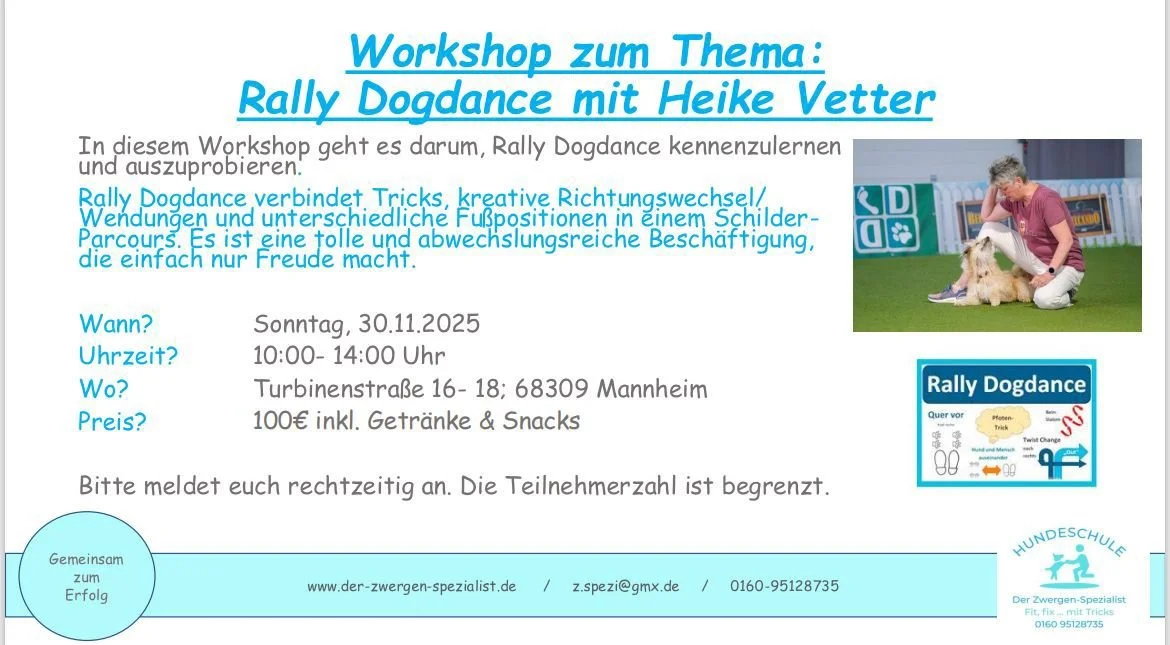 Diesr WORKSHOP ist für alle Mensch-Hund-Teams, die RALLY DOGDANCE kennenlernen möchten. Wir beginnen den Workshop mit einem kleinen Theorie-Teil um dann relativ schnell in die praktische Arbeit mit dem Hund zu starten.